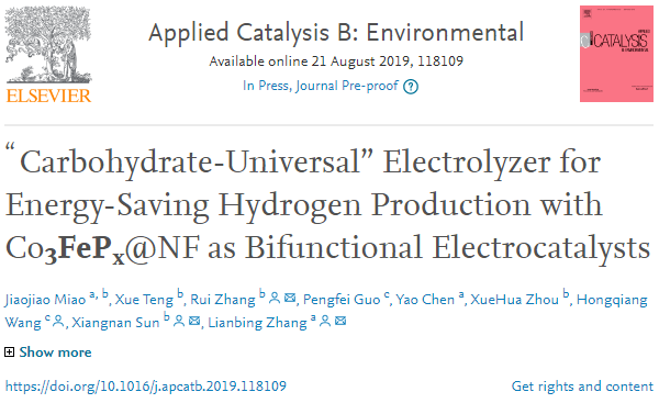 日前,西北工业老员工命学院张连兵教授与国家纳米科学中心孙向南教授、williamhill威廉希尔官网材料学院王洪强教授合作,在国际催化领域知名期刊《Applied Catalysis B: Environmental》(IF 14.229)在线发表题为“Carbohydrate-Universal Electrolyzer for Energy-Saving Hydrogen Production with Co3FePx@NF as Bifunctional Electrocatalysts”的学术论文,在生物质电解制氢研究领域取得了进展。