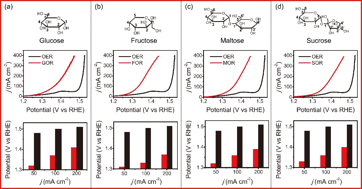 生物质是地球上最为丰富的绿色可再生资源之一,其中90%为碳水化合物。但在近几十年来,合成工业急速发展引起了大量生物质资源的废弃,包括农作物秸秆、林业剩余物、农产品加工废弃物、畜禽粪类、城市生活垃圾等,与此同时也带来了巨大的环境污染。另一方面,随着全球不可再生资源的急剧消耗,环境污染处理以及能源需求等问题变得日益严峻。通过电解水提供的氢能被认为是未来最有前途的一种清洁、可再生的绿色能源。然而,水分解的产氧反应常需要较高的过电位才能产生较大的电流密度,导致整体产氢能效低。而采用热力学更有利的废弃生物质氧化反应来取代产氧半反应,不仅可以降低电解制氢的能耗,还可以得到高附加值的生物质制品。然而废弃生物质多为碳水混合物,单一化合物的提取必然伴随着大量能源的消耗,违背了节能制氢的初衷。