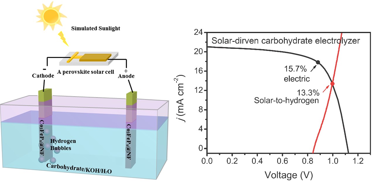 针对这一挑战,研究团队首次提出了“碳水化合物通用性”催化剂这一概念,合成了具有这一属性的三元过渡金属磷化物催化剂,实现了不同种类碳水化合物葡萄糖等(单体)、蔗糖等(二聚体)甚至淀粉(多聚体)的电催化节能制氢,也为生物质废弃物的处理和再利用提供了新的途径。得益于该节能策略,废弃生物质电解池可仅由一节钙钛矿太阳能电池驱动并获得较高的光制氢效率,完成了“整体可持续”制氢体系的构建。