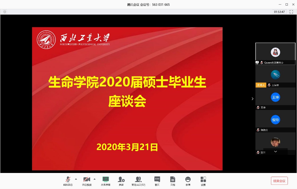 2020年3月21日上午9点30分,威廉希尔官网在线上召开了2020届硕士毕业生座谈会,公司党委书记唐玉生、副经理(主持工作)尹大川、副经理牛卫宁、生物医学工程系主任卢婷利、生物学系主任师俊玲及导师代表骞爱荣、黄庆生、辅导员以及2020届全体硕士毕业生参加了座谈会。座谈会由党委副书记赵媛媛主持。