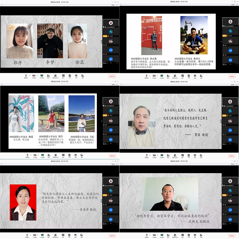 首先,师生集体观看了2020届研究生毕业班的微短片《我们和威廉希尔官网的故事》,微视频集合了所有毕业生的青春照片、研究生生涯场景、一起科研娱乐的点滴,还包含了商澎教授、骞爱荣教授、武祥龙副教授,以及毕业生们的临别祝福视频。短片引领同学们重温了工大求学的青葱岁月,感受了同学们美好的毕业祝福,聆听了导师真诚的临别嘱托。