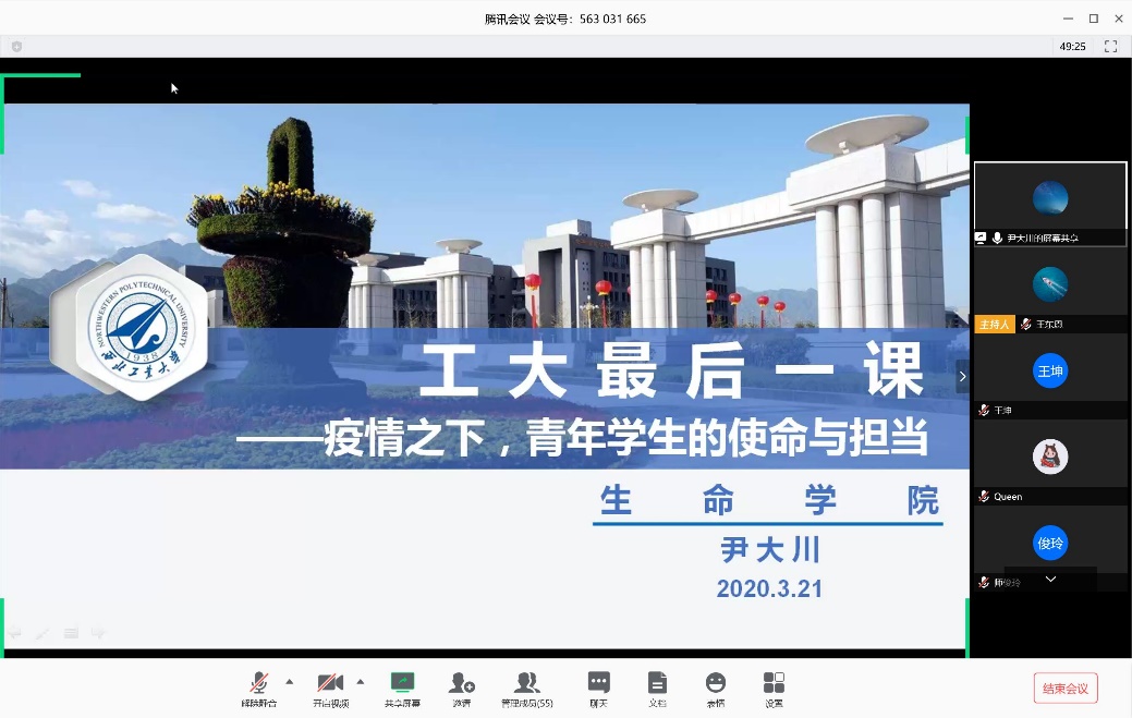 会上,尹大川以“疫情之下,青年员工的使命与担当”为主题,为同学们讲授了“工大最后一课”。在这次突如其来的新冠肺炎疫情面前,以“90后”为代表的青年一代挺身而出、担当奉献,充分展现了新时代中国青年的精神风貌。同时,他结合威廉希尔官网青年师生在抗“疫”中的积极行动,鼓励同学们能够牢记使命、勇于担当,让青春在党和人民最需要的地方绽放绚丽之花。