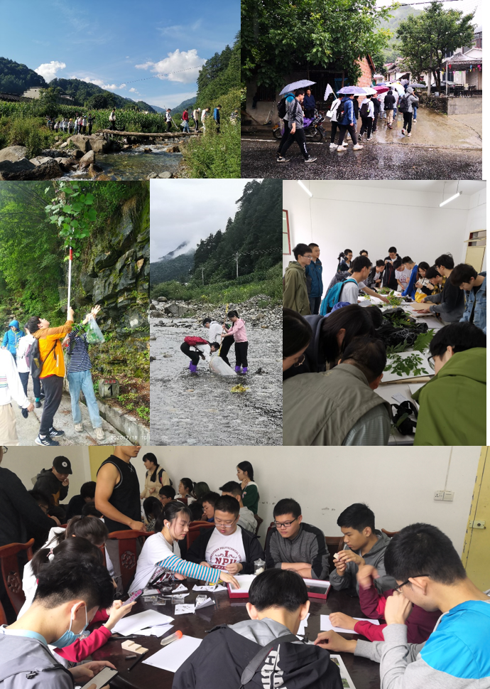 实习期间,大家8至10人为一组,以组为单位展开实习活动,同学们很快学会了分工合作,分配使用实习器材。因天气原因,同学们多次冒着绵绵细雨,在不同的地形条件下采集动植物材料,随后在实验室制作处理动植物标本并进行鉴定。植物实习过程中,同学们认识了很多日常生活中难以见到的美丽植株,如月见草、叶上珠、珍珠菜、长叶紫珠、龙牙草等;动物组的同学需要早早的晨起观鸟,观察到了多种保护鸟类,如红尾水鸲、北红尾鸲、黄鹡鸰、褐河乌等,白天在山道上捕捉到了单尾凤蝶、粉蝶、蛱蝶以及各种各样的鞘翅目、革翅目、双翅目的昆虫。