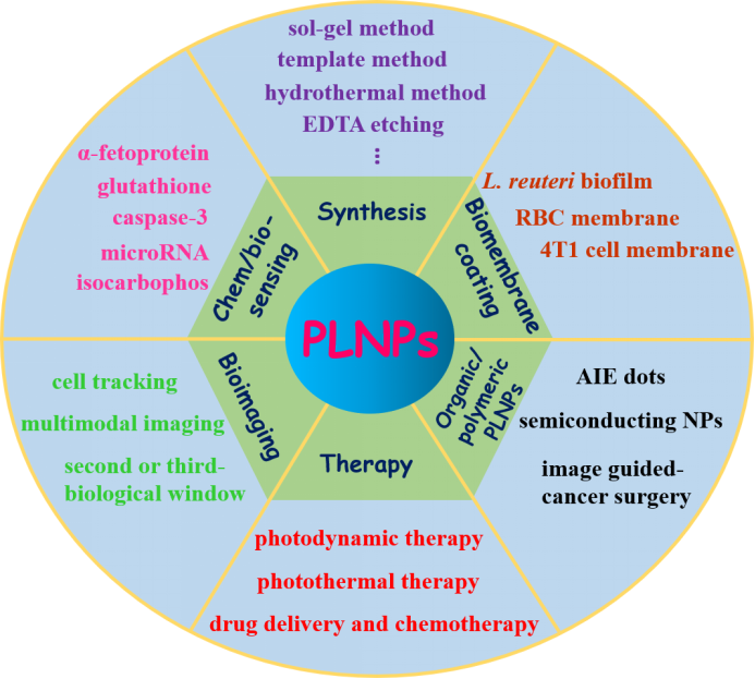 长余辉材料在激发停止后具有余辉发光特性。近十年来,长余辉纳米材料(PLNPs)在各个领域引起了广泛的关注和研究。特别是近年来,在生物医学领域的发展和应用得到了广泛的探索。由于有效地消除了生物组织自身的荧光干扰和超长的近红外(NIR)余辉发射,PLNPs在生物传感、细胞跟踪、生物成像和肿瘤治疗等方面的应用受到了广泛关注。这些成就激发了人们对设计具有优越特性和多种功能的新型PLNPs的兴趣。作者综述了PLNPs的合成方法、生物应用、生物膜修饰和生物安全性等方面的研究进展,并重点介绍了生物传感、成像和成像引导治疗的最新进展。作者进一步讨论了新型PLNPs作为一类新型功能性生物材料的应用。最后,对存在的问题和挑战进行了讨论,并对未来生物医学应用的发展方向进行了展望(图6)。相关综述文章发表在“中国最具国际影响力学术期刊”之一的Nano-Micro Letters上(2020, 12(1),70; doi:10.1007/s40820-020-0404-8)。