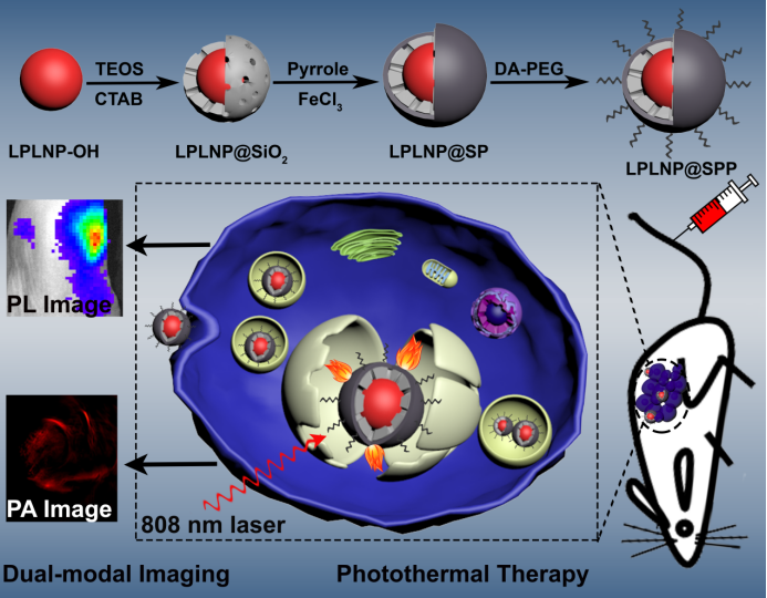 乳腺癌是女性最常见的恶性肿瘤之一,肿瘤侵袭性高,预后差。急需要高灵敏成像和高效治疗手段。作者设计合成了长余辉-聚吡咯纳米复合物(LPLNP@SPP)用于乳腺癌的余辉/光声双模态成像和光热治疗。论文中优化了长余辉纳米材料的配比,得到了具有700nm发射的长余辉纳米材料,余辉时间超过24小时。通过后续水热和化学氧化的方法将二氧化硅和聚吡咯壳层依次包覆在长余辉纳米材料表面,经过表面修饰后得到具有双功能的LPLNP@SPP(图1)。