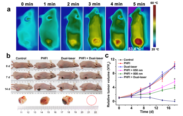 图5.PHFI肿瘤治疗效果。(a)光热升温效果图;(b,c)肿瘤联合治疗