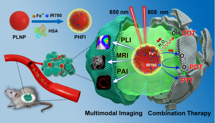 活性氧介导的肿瘤化学动力疗法和光动力疗法在实际的肿瘤联合治疗中引起了广泛的关注。然而,严苛的治疗条件和乏氧微环境严重限制了这些治疗方法的疗效。作者设计合成了一种长余辉纳米复合物(PLNP-HSA-Fe3+-IR780,简称PHFI),用于癌症多模态成像和有效的光增强联合治疗(图3)。