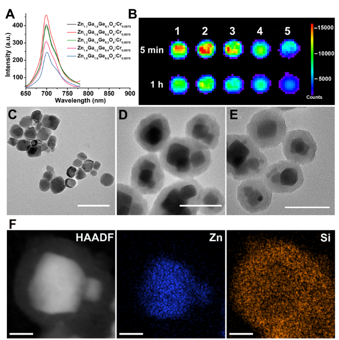 图1.LPLNP@SPP合成及表征。(A,B)长余辉纳米材料发射光谱及余辉性质表征;(C-E)长余辉纳米材料及复合物透射电镜表征;(F)LPLNP@SPP能谱表征