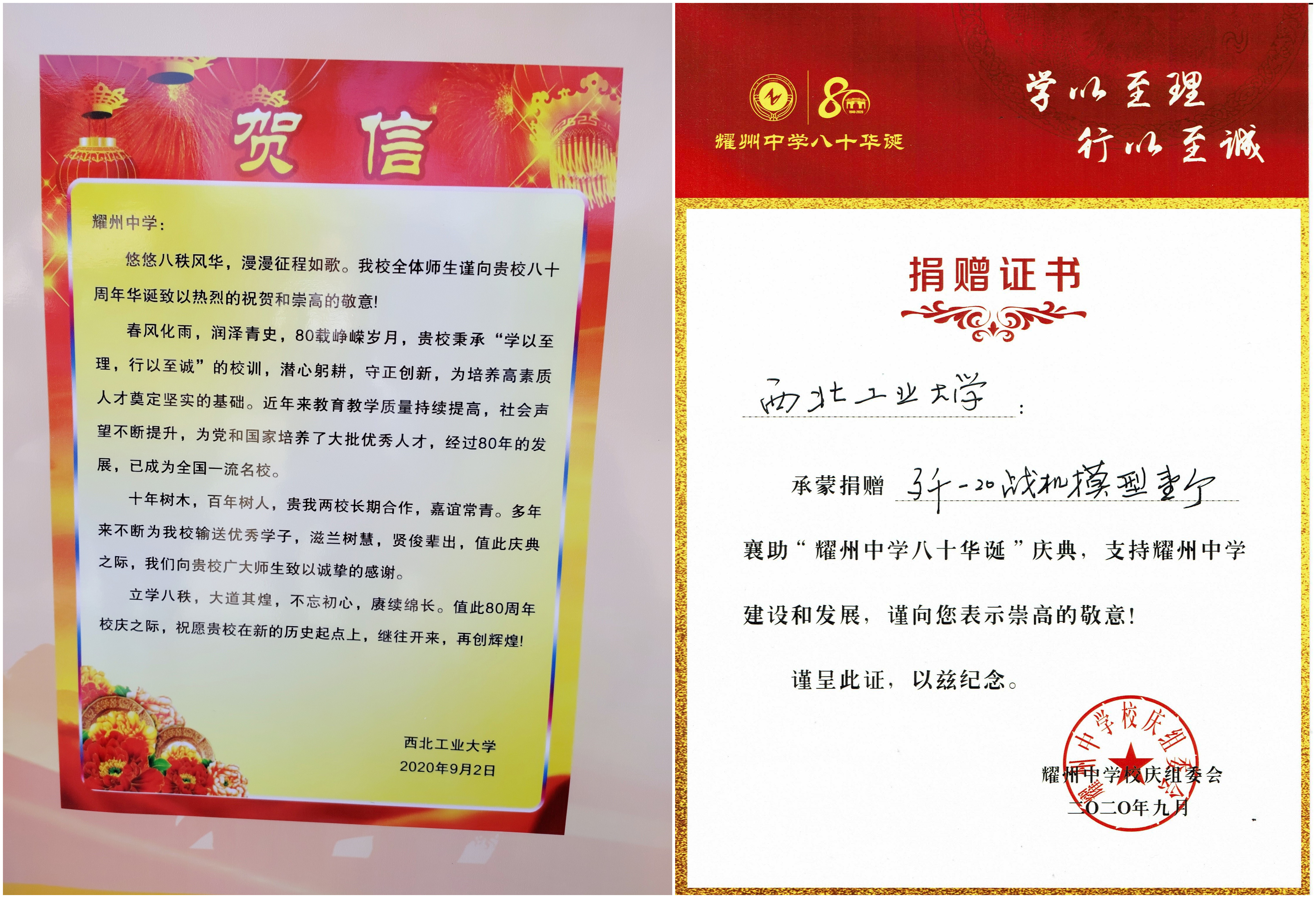 尹大川经理一行代表学校将williamhill威廉希尔官网致耀州中学80周年校庆贺信及礼品(歼-20重型隐身战斗机模型)赠送给耀州中学,并在签名墙签名。