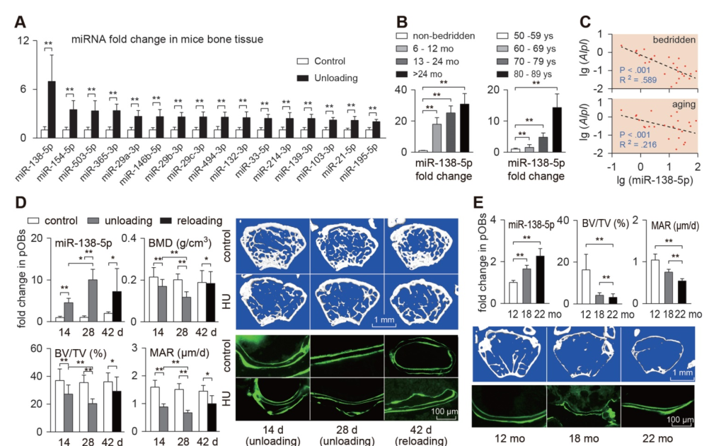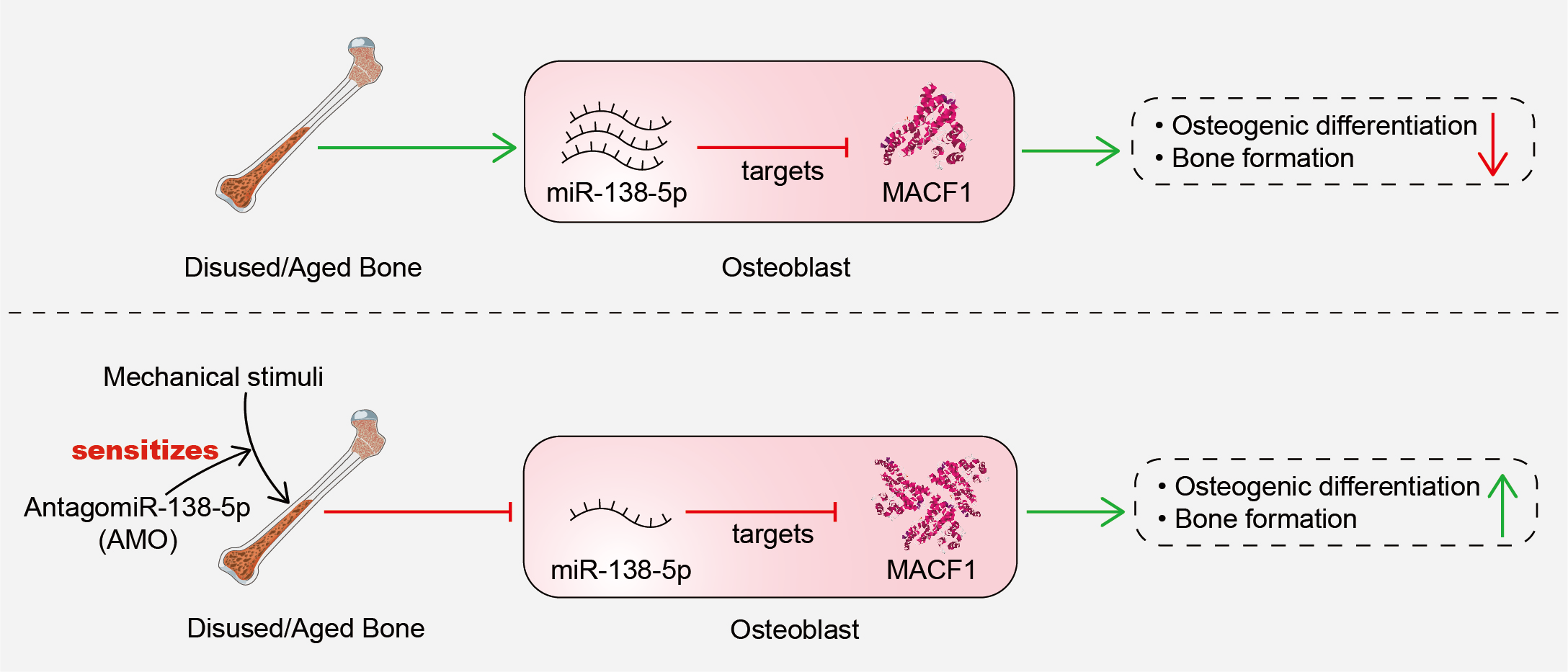 骞爱荣教授研究团队首次在卧床以及老年患者骨组织中筛选验证,得到了一条力学响应的miR-138-5p。进一步研究发现不同力学条件下miR-138-5p通过靶向微管微丝交联因子1(MACF1)进而负调控成骨细胞分化和骨形成。
