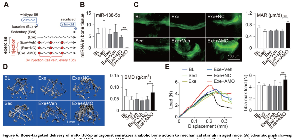 动物治疗实验结果发现,成骨靶向递送miR-138-5p的抑制剂可以缓解后肢去负荷导致的废用型骨质疏松。最重要的研究团队还发现在miR-138-5p表达水平较高的转基因小鼠和老龄小鼠中,单独的力学加载(跑步)对骨形成的增加效果并不明显,而当跑步的同时注射miR-138-5p的抑制剂后,转基因小鼠和老龄小鼠的骨形成能力明显增加。结果表明miR-138-5p的抑制剂可作为力学增敏剂为治疗废用型或老年性骨质疏松提供新的策略,即不能运动的情况下(卧床),采取给药治疗;仅能少量运动的情况下(老年人,航天员),同时采取运动和给药治疗,对骨质疏松的治疗效果更好。