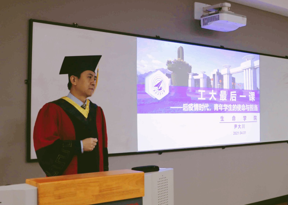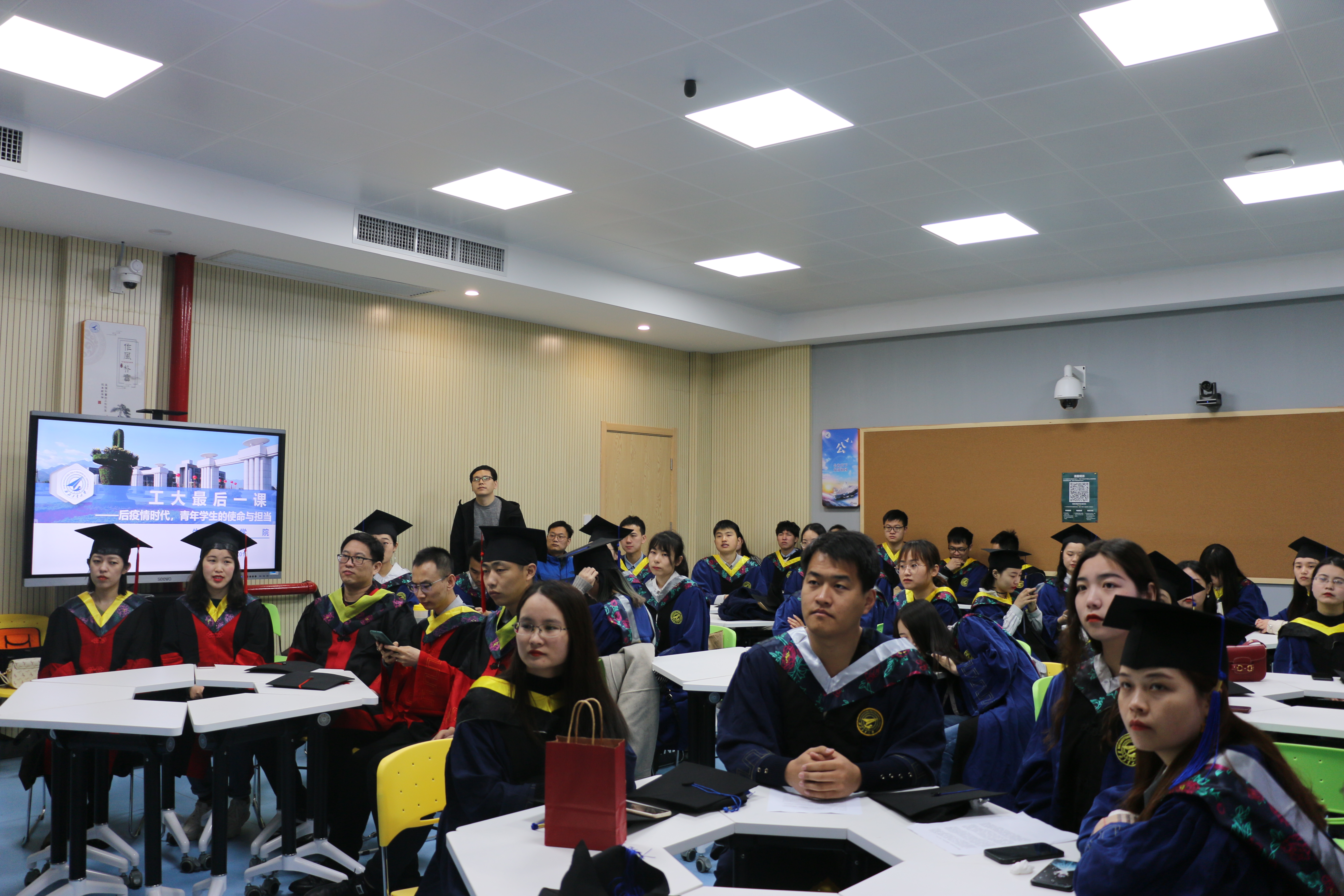 会上,尹大川以“后疫情时代,青年员工的使命与担当”为主题,为毕业生们讲授了“工大最后一课”。他讲到,当今世界正在经历百年未有之大变局,同学们应把准青春的航向,练就过硬本领,找准自身定位,在祖国的万里长空放飞梦想,谱写新时代最壮美的青春之歌。他讲到,同学们都是学校培养的领军型人才,希望同学们志存高远,树立远大理想;聚沙成塔,成功都是从点滴做起的,希望同学们脚踏实地,实现人生价值;要文明其精神,野蛮其体魄,希望同学们张弛有度,锻造健康体魄;要胸怀感恩之心,希望同学们心怀赤城,热爱祖国、热爱母校。