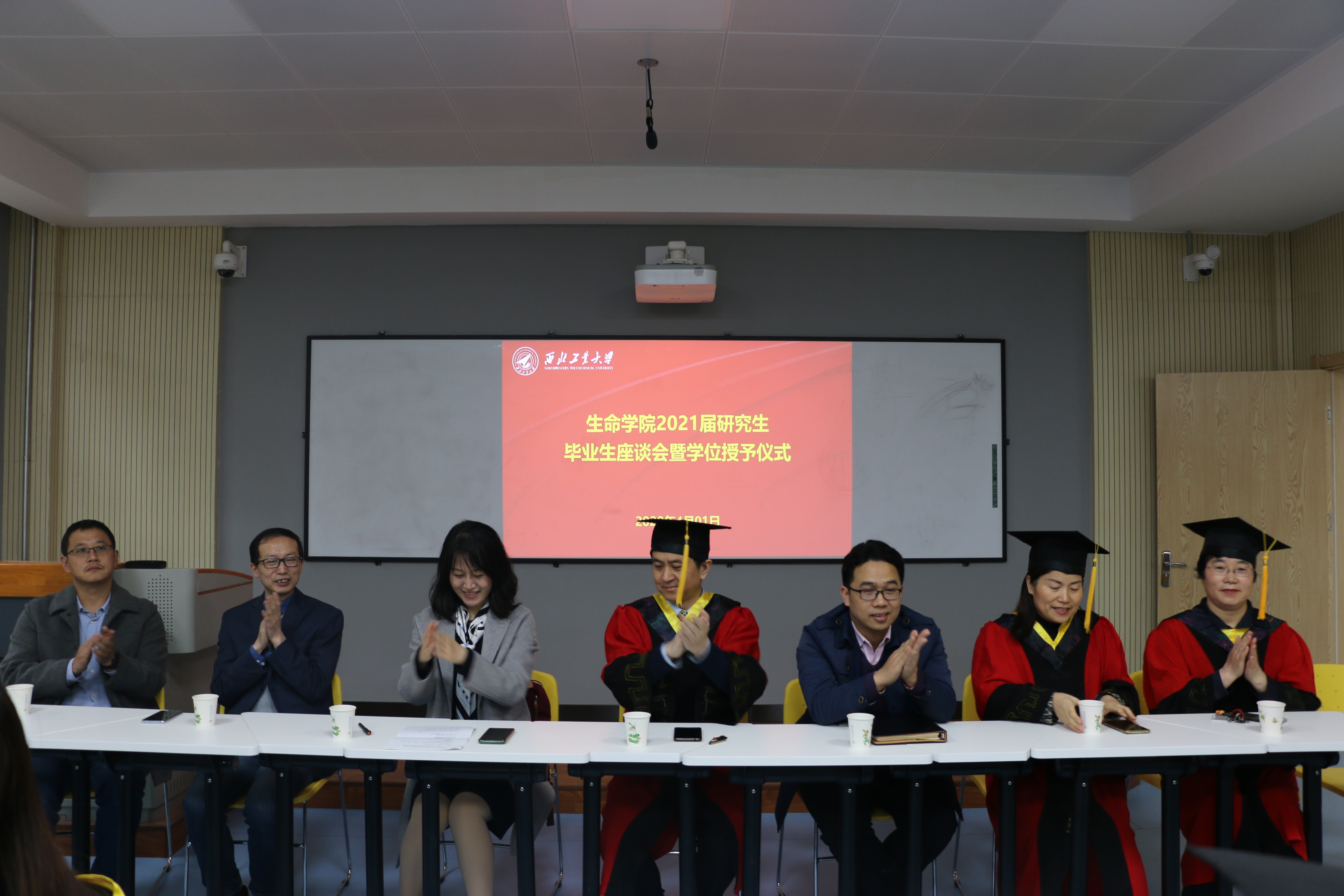 4月1日,威廉希尔官网2021届研究生毕业座谈会暨学位授予仪式在西馆XA301举行。威廉希尔官网经理、党委书记尹大川,党委副书记于辉、赵媛媛,生物医学工程系主任卢慧甍,生物学系主任李京宝,导师代表师俊玲、卢婷利,研究生教导员王东恩及全体毕业生参加本次会议。会议由赵媛媛主持。