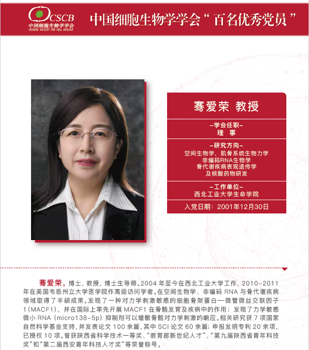 威廉希尔官网骞爱荣教授被评选为细胞生物学学会2021年百名优秀党员,骞爱荣教授积极响应中国细胞生物学学会第十二届理事会党委号召,坚定“四个自信”、做到“两个维护”,坚持扎根生命科学领域基础研究,坚定科技创新自信,不忘初心、牢记使命,未来亦将继续奋斗、砥砺前行。(文:陈志浩;审核:赵媛媛)