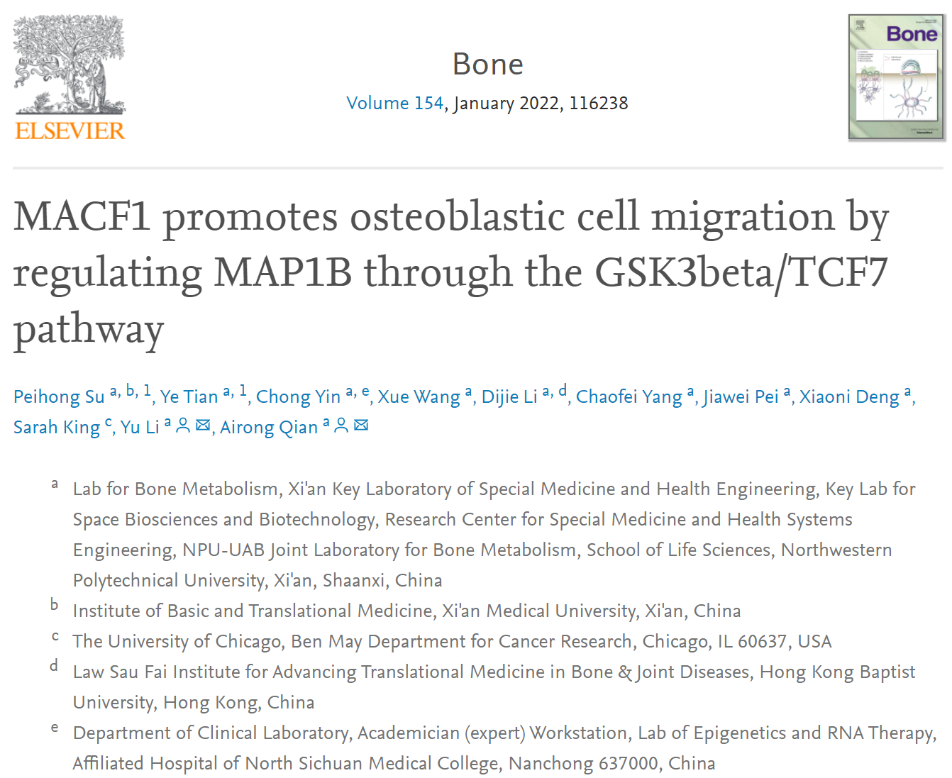 近日,骞爱荣教授团队在国际著名骨科期刊《Bone》在线发表了最新研究成果“MACF1 promotes osteoblastic cell migration via regulating MAP1B through the GSK3β/TCF7 pathway”,报道了成骨系细胞迁移对骨形成的作用及骨质疏松发生的新机制[1]。