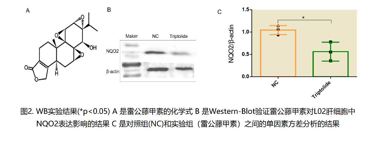 为了验证CSLN方法的有效性,本团队随后对天然药物分子进行了一个案例研究。我们选择一种备受关注的天然药物分子雷公藤甲素作为验证对象。在计算实验中,CSLN表现出了优异的性能。在前20个与雷公藤甲素相互作用的预测靶点中,有13个与TCMSP等其它数据库是一致的。另外,在生物实验中,我们选择在预测靶点中并未在以往研究中报道过的NRH dehydrogenase [quinone] 2 (NQO2)作为研究对象,进一步验证CSLN的准确性。实验结果显示,与空白组相比,药物组在L02肝细胞中NQO2的表达量降低。这意味着雷公藤甲素可以下调NQO2的表达。这再次证明了CSLN在全新天然药物分子的靶点筛选上具有较高的准确性(图2)。该论文发表在《Journal of Translational Medicine》上[1],其在线链接为:https://doi.org/10.1186/s12967-022-03279-w。