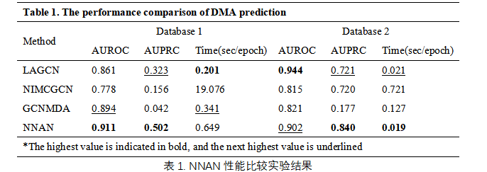 为评估NNAN模型性能,我们使用5折交叉验证法在两个公开数据集上与三种基线方法进行比较实验,并使用AUROC与AUPRC作为衡量预测潜在DMAs的性能指标,验证分子结构相似的药物是否可以与基因序列相似的微生物发生相互作用。综合结果表明,NNAN优于其他竞争方法(表1)。