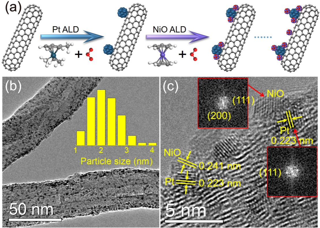 双金属协同催化是调控催化性能的一个重要途径。双金属催化剂具有不同于其相应的单金属催化剂的独特电子和化学特性,这使得双金属催化剂常表现出显著的协同效应。本研究利用先进的ALD技术设计合成了一种高活性、高稳定性PtNi/CNTs双金属催化剂,对于氨硼烷水解制氢及5-羟甲基糠醛的选择性加氢反应显示出优异催化性能。Pt-Ni界面的数量可通过NiO ALD的循环次数进行精细的调控,这是其他传统方法难以实现的。通过多种表征技术、动力学-同位素和DFT明确了双金属的活性位点及双金属在催化反应中的作用机制,该研究为其他高效双金属催化剂的设计合成提供了一定的借鉴与指导。