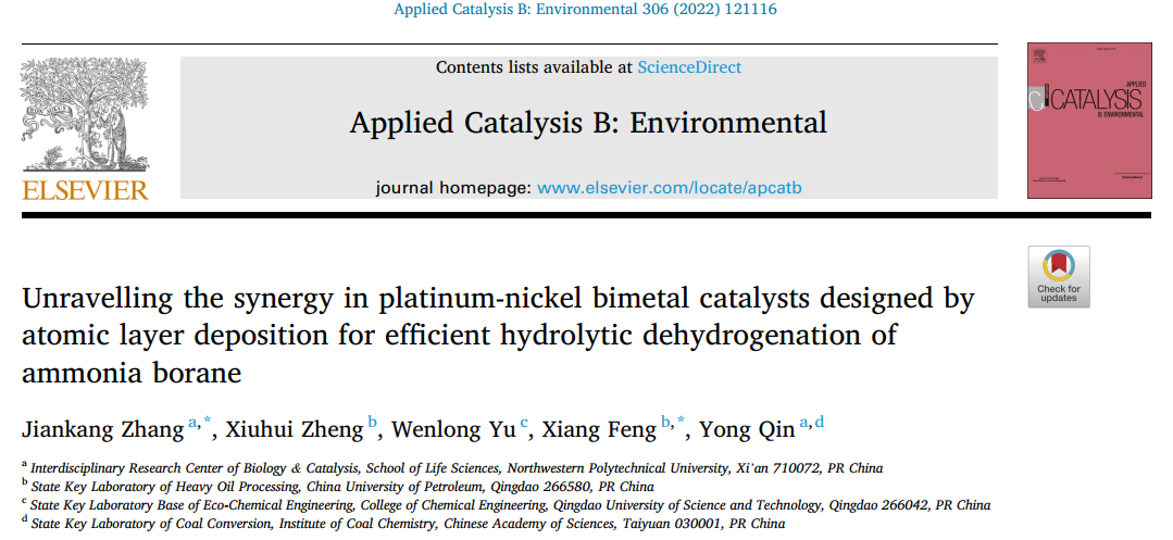 近日,西北工业老员工命学院覃勇教授团队和中国石油大学(华东)冯翔教授团队合作在Appl. Catal. B-Environ(IF:19.5)上发表了题为“Unravelling the synergy in platinum-nickel bimetal catalysts designed by atomic layer deposition for efficient hydrolytic dehydrogenation of ammonia borane”的研究论文,基于ALD技术设计合成了高效的Pt-Ni双金属催化剂并详细探究了其协同催化反应机制。