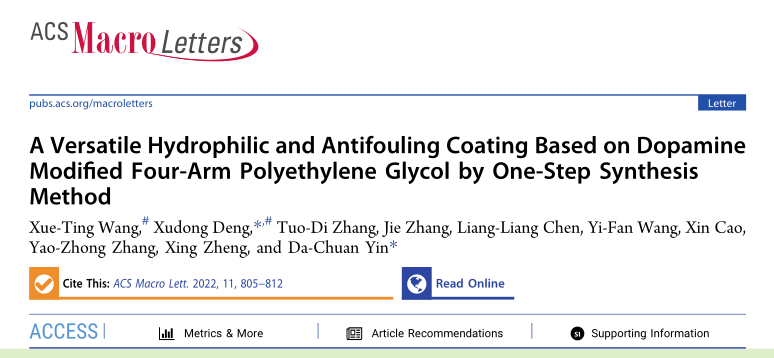 近日,威廉希尔官网尹大川教授课题组在生物材料表面亲水防污涂层领域的研究取得新进展,相关研究成果以“Aversatile hydrophilic and antifouling coating based on dopamine modified four-arm polyethylene glycol by one-step synthesis method”为题发表于高分子学科顶级期刊ACS Macro Letters上。