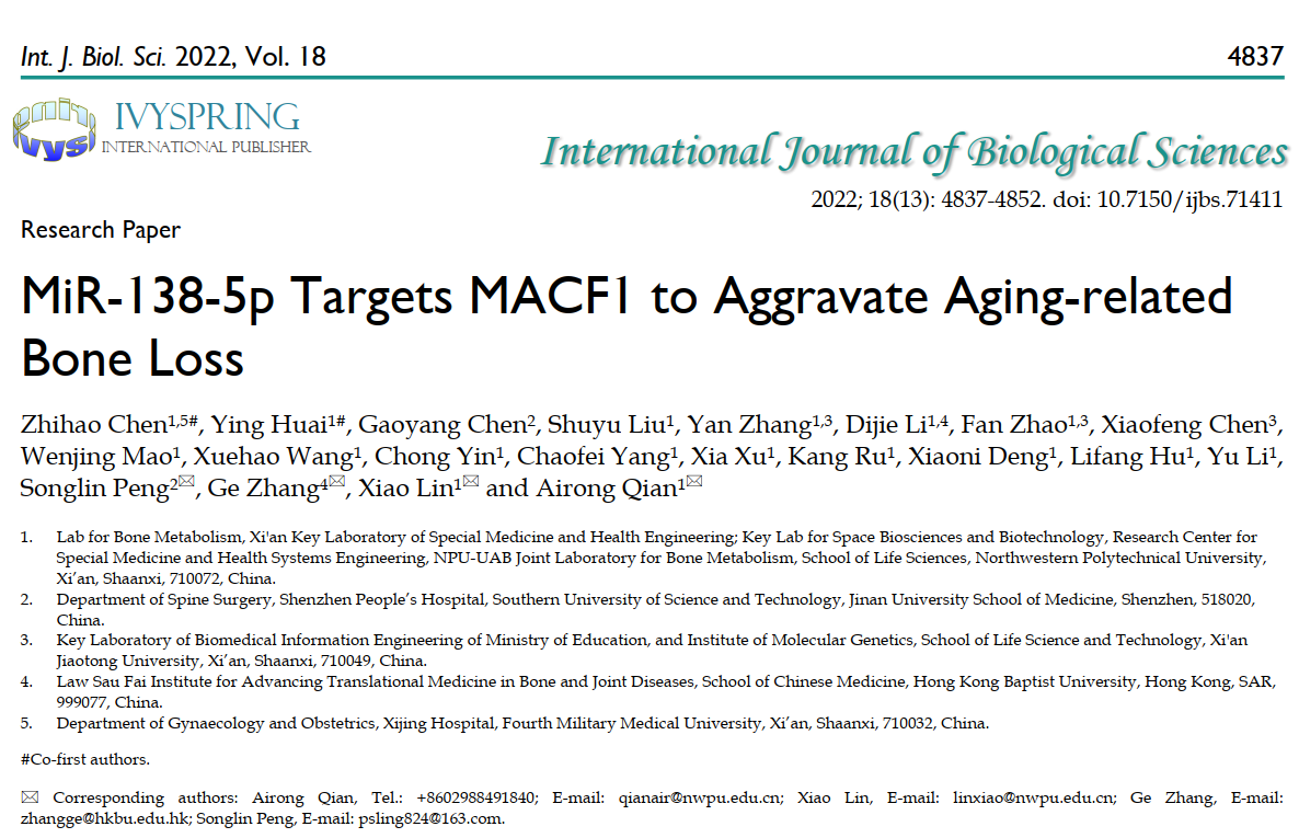 近日,威廉希尔官网骞爱荣教授团队在国际著名期刊《International Journal of Biological Sciences》(JCR Q1, IF: 10.75)在线发表了题为“MiR-138-5p Targets MACF1 to Aggravate Aging-related Bone Loss”的最新研究成果,在老龄骨质疏松的诊断与治疗领域取得了新的研究进展,引起了国内外同行广泛关注。