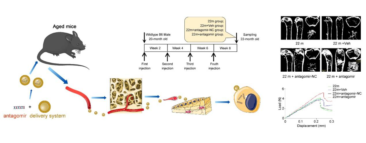 本研究通过生信分析结合临床老龄骨质疏松患者样本验证,发现miR-138-5p表达随着年龄增加而增加,且与骨形成负相关。而且在miR-138-5p高表达的老龄转基因小鼠中,骨质疏松进一步加剧。进一步探索机制发现,miR-138-5p通过靶向MACF1进一步加剧了老龄或衰老导致的成骨细胞分化以及骨形成能力的下降。因此,基于miR-138-5p在老龄骨质疏松中的功能,设计miR-138-5p的抑制剂antagomir,并结合香港浸会大学张戈教授提供的成骨靶向递送系统,将miR-138-5p的抑制剂靶向递送到老龄小鼠的骨形成表面的成骨细胞。结果表明miR-138-5p的抑制剂antagomir可以明显缓解老龄小鼠的骨质疏松症状。