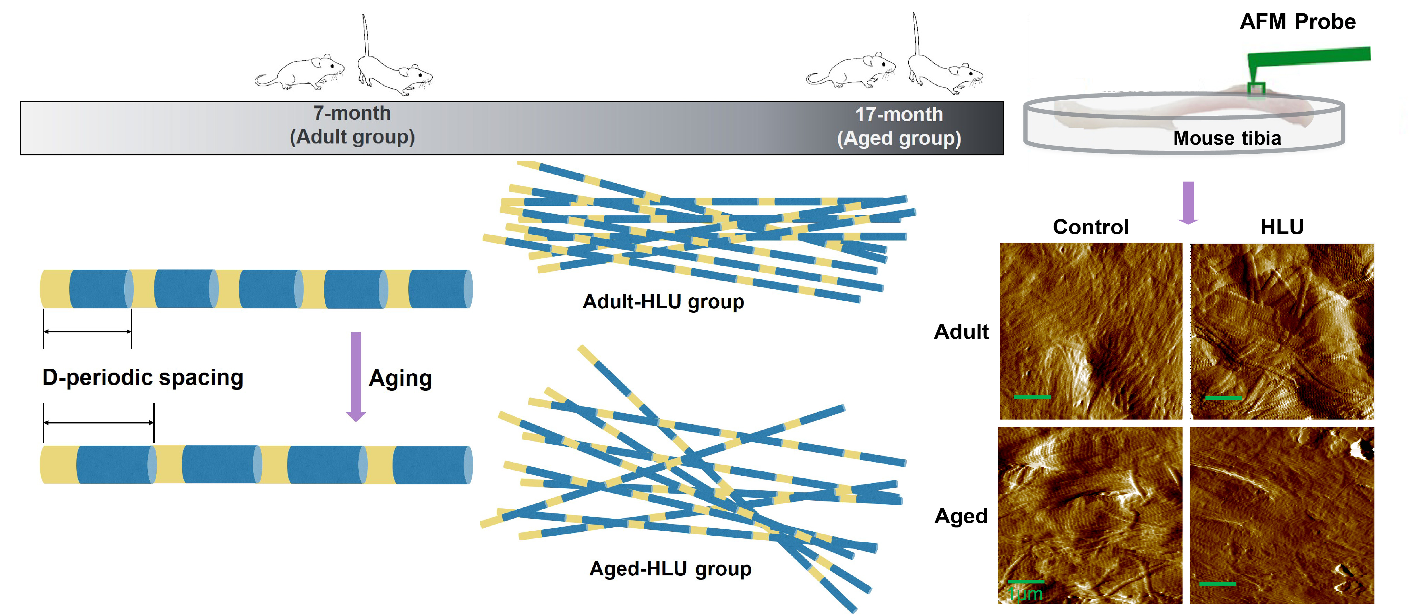 骨是由矿物质和蛋白基质有机结合的多层级复合材料。骨胶原蛋白形成的纤维网状结构是矿物质沉积的基本骨架,其对骨形成多尺度层级结构和独特的力学行为至关重要。骨在微观尺度的力学性能和结构如何影响其宏观力学性能一直是骨生物力学和生物材料领域的研究热点。增龄是机体生长、成熟和衰老的生理过程,该过程导致骨的力学行为和对力学环境的响应发生改变。然而,骨胶原纤维的增龄性变化,及其影响骨宏观结构性能和响应特殊力学环境的规律并不清楚。