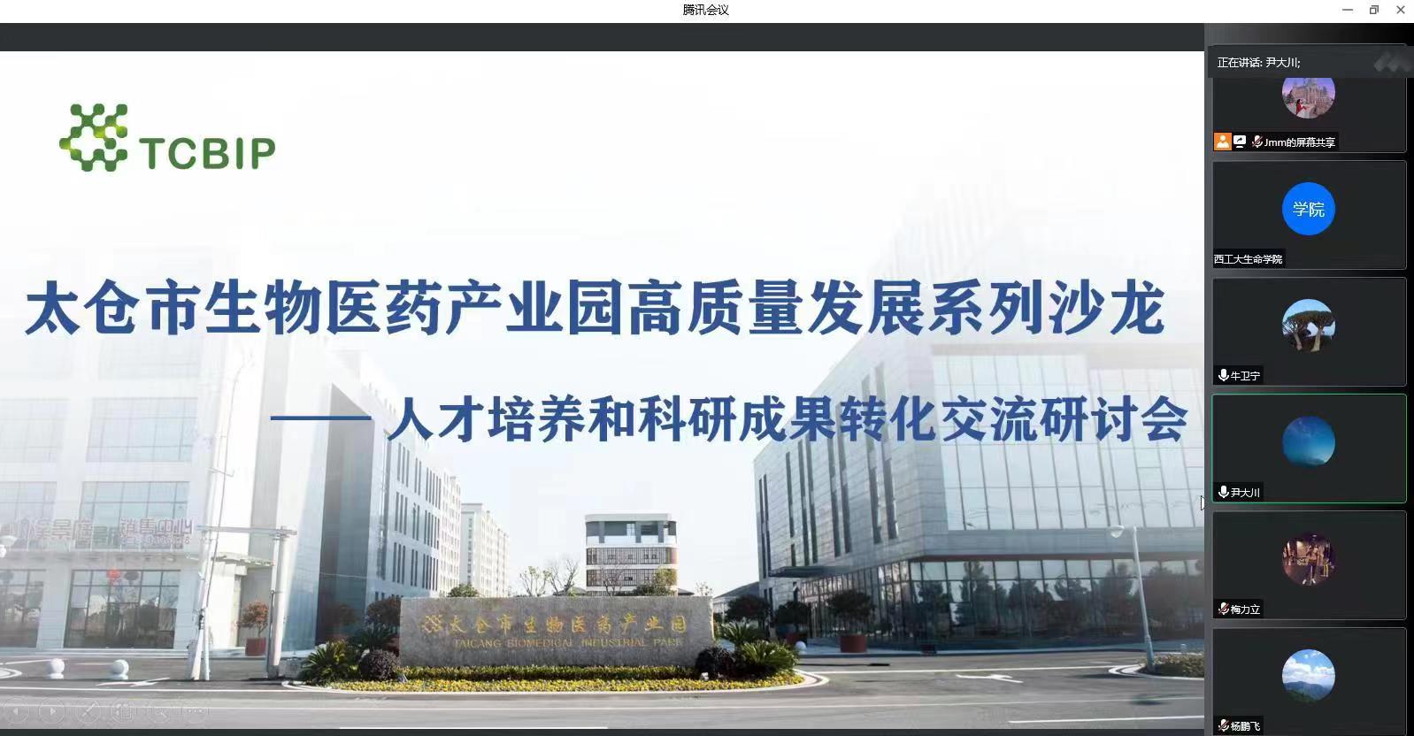 为积极推进校企合作,联合培养生物医药创新型人才,加速科研成果转化落地,9月26日下午,威廉希尔官网与太仓市生物医药产业园人才培养和科研成果转化交流研讨会在线召开。太仓市生物医药产业园有限公司总经理李百军、企业服务部主管王锐、7家企业代表,威廉希尔官网经理尹大川、副经理牛卫宁及部分教师参会。会议由牛卫宁、王锐主持。