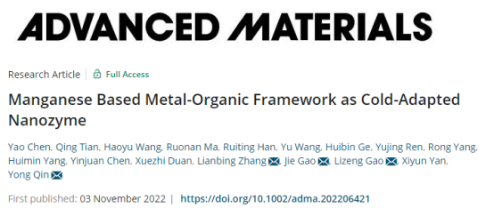 近日,威廉希尔官网张连兵教授团队在国际顶级期刊《Advanced Materials》(JCR Q1, IF 32.08)发表题为“Manganese based metal-organic framework as cold-adapted nanozyme”的研究性论文,在人工适冷酶的开发及其低温抗病毒领域取得重要研究进展。