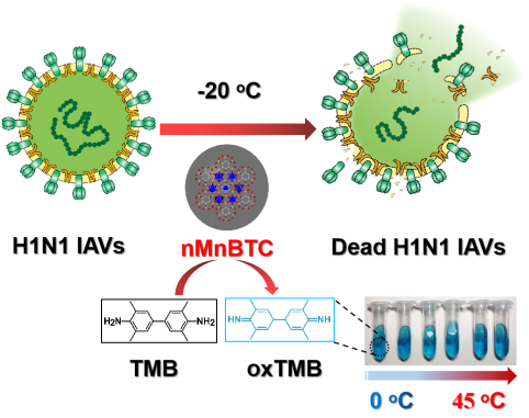 受天然适冷酶(锰氧化酶)结构与催化机制的启发,团队以具有类天然酶金属-有机配位结构的金属有机框架材料(MOF)为平台,基于理性设计与精准构筑,创新性地开发出基于超细锰基MOF(nMnBTC)的适冷纳米酶。该纳米酶不仅在0℃的低温区表现出优异的酶催化活性,且在温度升至中温区(45℃)的过程中催化活性几乎不变,这一现象突破了天然酶和常规人工酶只在特定温区具有最佳活性的传统认知。进一步,结合先进技术表征和催化动力学分析深入揭示nMnBTC的低温催化机制,为人工适冷酶的构筑提供重要理论模型。在此基础上,构建了以nMnBTC为关键组件的新型低温抗病毒策略,在甚至-20℃的低温条件下对H1N1流感病毒表现出高效的杀伤性能。这些研究成果为发展低温生物医学和基于低温生物催化的绿色化学途径提供了极为重要的理论与技术参考。
