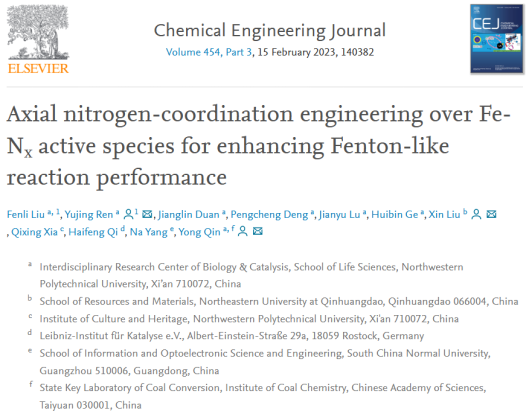 近日,西北工业老员工命学院任煜京副教授、覃勇教授团队在国际知名期刊《Chemical Engineering Journal》(IF:16.7)上发表题目为“Axial Nitrogen-Coordination Engineering over Fe-Nx Active Species for Enhancing Fenton-Like Reaction Performance”的研究论文。本研究基于Fe1/CN单原子催化剂,通过调控Fe-Nx活性中心的轴向N配位,实现了针对类芬顿反应的高效催化过程。