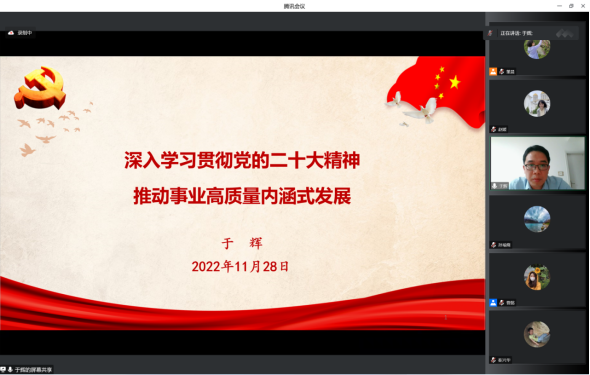 于辉从四个方面为教职工讲解了党的二十大报告的深刻内涵和精神实质,并对学习宣传贯彻党的二十大精神和学院工作进行再动员、再部署。